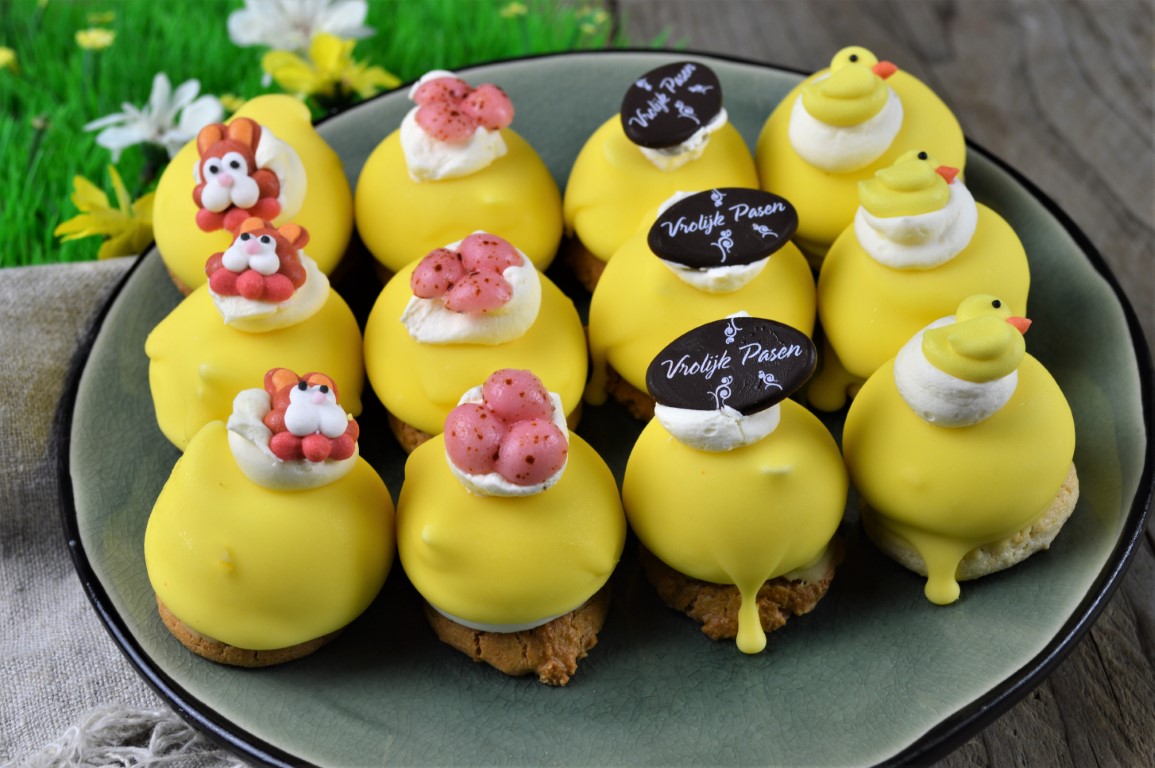 Twaalf kleine bitterkoekjes die opgespoten zijn met een heerlijke botercrème en afgewerkt in Paassfeer. Dit kunnen wij wel één van onze specialiteiten noemen! Leuk, en vooral lekker bij de koffie en feestelijk bij het dessert! Deze mogen dus niet ontbreken met Pasen. Eén luxe koekje weegt circa 20 gram.